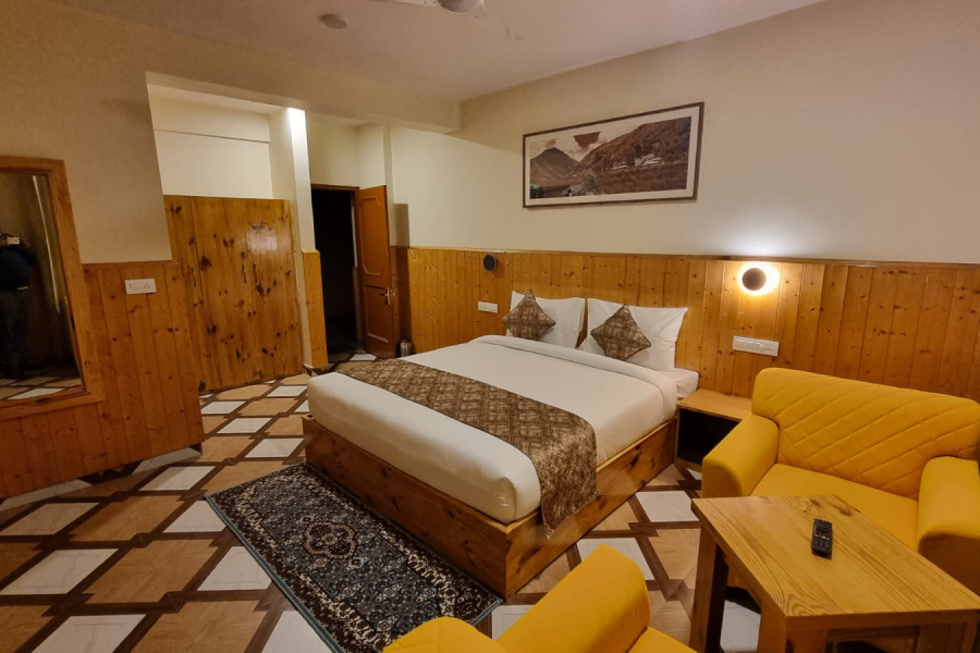 The Deluxe Room at Carom Inn, offers a perfect mix of comfort and contemporary style. Thoughtfully designed with warm tones and elegant furnishings, the room provides a cozy and relaxing ambiance ideal for unwinding after a day of exploring the hills. Large windows let in ample natural light and open up to picturesque views of the lush valleys and misty mountains.
