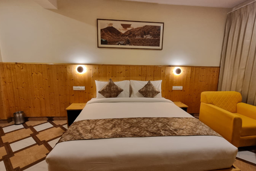 The Executive Suite Room at Carom Inn, redefines luxury with its spacious layout, elegant design, and panoramic views of the majestic Himalayas. Thoughtfully crafted for ultimate comfort, the suite features a separate living area, tasteful wooden interiors, and large windows that invite the beauty of nature indoors. The serene ambiance makes it an ideal choice for guests seeking privacy and relaxation in a refined mountain setting.
