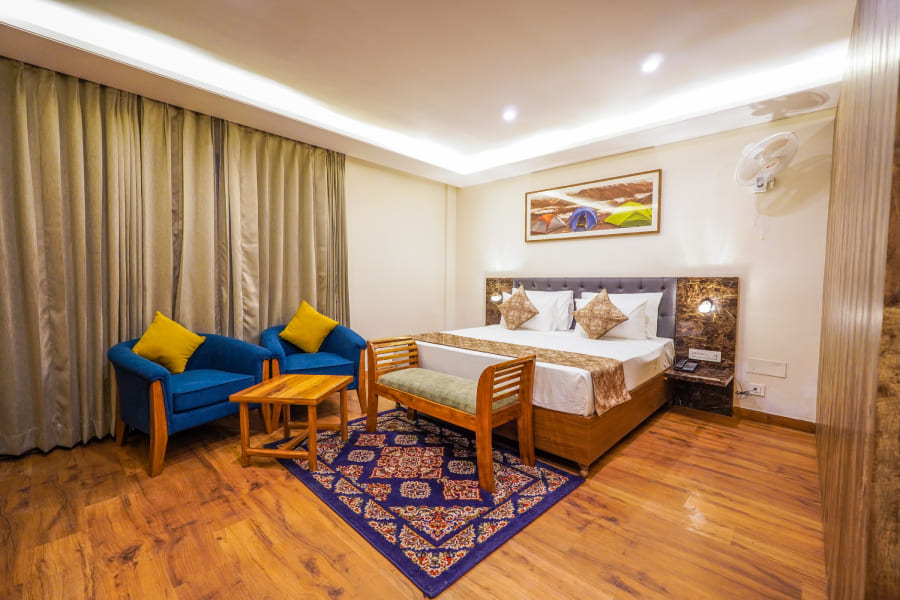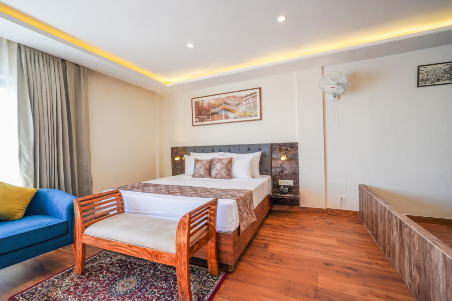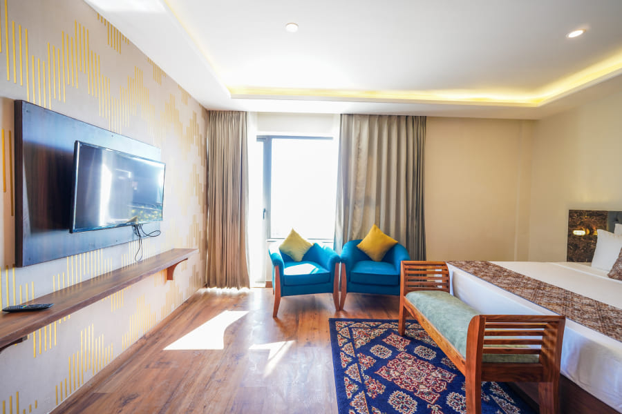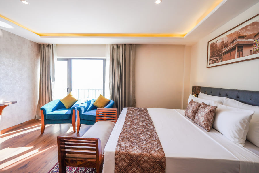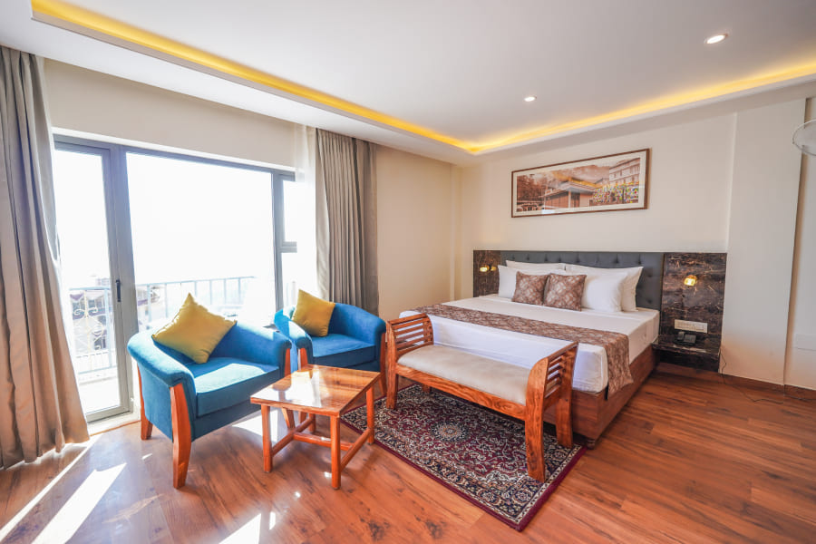 The Executive Suite Room at Carom The Castle Resort, Fagu, Shimla, redefines luxury with its spacious layout, elegant design, and panoramic views of the majestic Himalayas. Thoughtfully crafted for ultimate comfort, the suite features a separate living area, tasteful wooden interiors, and large windows that invite the beauty of nature indoors. The serene ambiance makes it an ideal choice for guests seeking privacy and relaxation in a refined mountain setting.