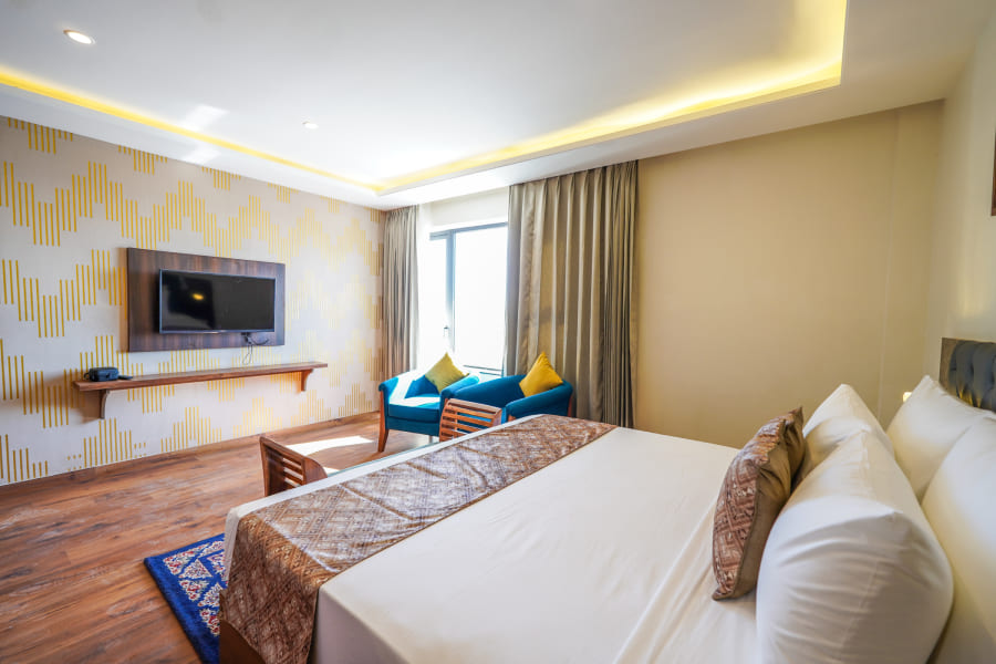 Complete with top-notch amenities such as a king-sized bed, premium furnishings, high-speed Wi-Fi, a flat-screen TV, and a luxurious bathroom with modern fittings, the Executive Suite Room offers an indulgent experience. Whether you’re enjoying your morning tea by the window or unwinding in the cozy living space, this suite promises a perfect blend of sophistication, comfort, and tranquility at Carom The Castle Resort.