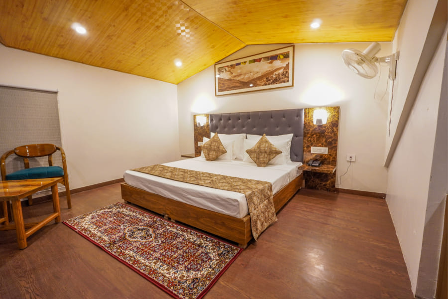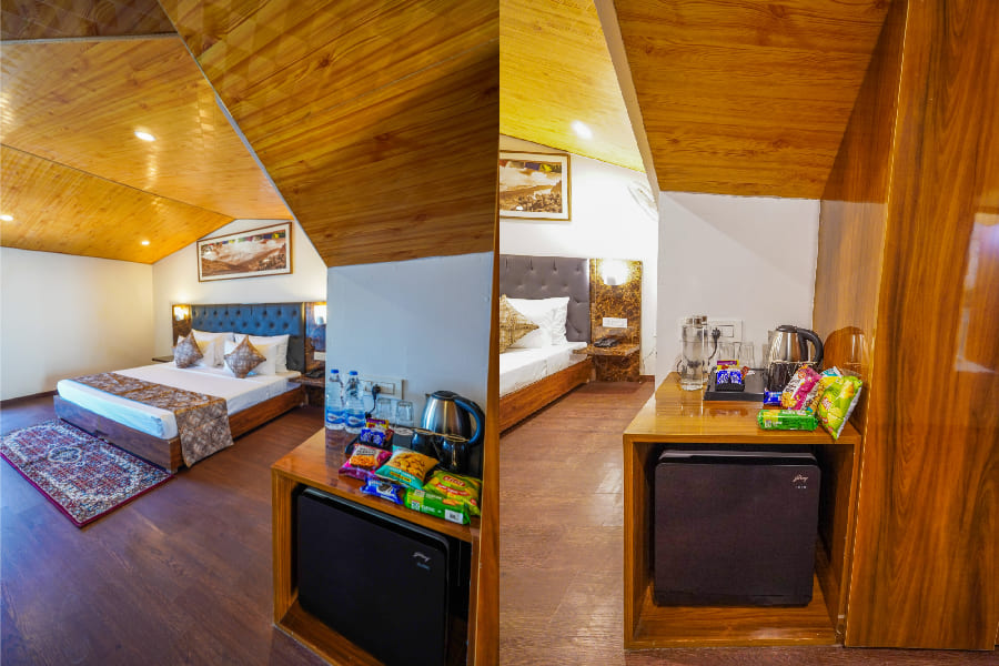The Superior Attic Room at Carom The Castle Resort, Fagu, Shimla, is a perfect blend of elegance and comfort. Set under charming sloped wooden ceilings, the room exudes a cozy, mountain-lodge vibe with warm interiors and tasteful furnishings. Large windows invite natural light and offer breathtaking views of the surrounding valleys and snow-capped peaks, creating a tranquil atmosphere for relaxation.